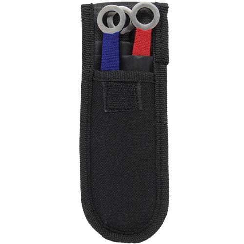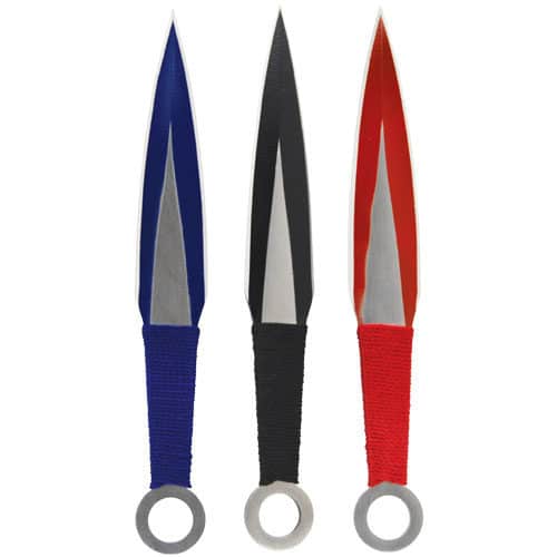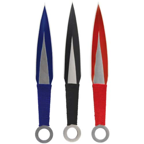 3 Piece Throwing Knife Assorted, black, blue, red Color . 6.5″ Length, 3 Piece Set, made from 440 stainless steel, great beginner to intermediate throwing knife. Includes sheath pouch for knives.